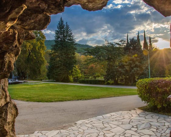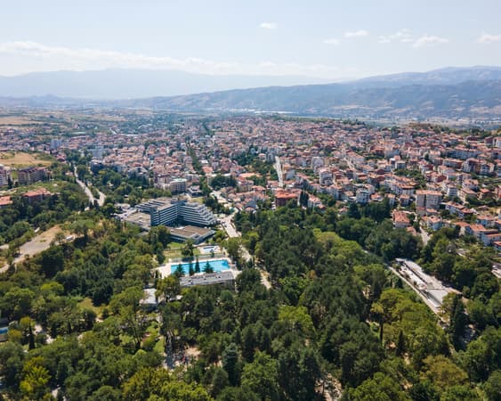 Sandanski formerly known as Sveti Vrach, Bulgarian: Свети Врач, until 1947[2]) is a town and a recreation centre in south-western Bulgaria, part of Blagoevgrad Province. Named after the Macedonian Bulgarian revolutionary Yane Sandanski, it is situated in Sandanski–Petrich Valley at the foot of Pirin Mountains, along the banks of Sandanska Bistritsa River. Sandanski is about 20 km away from Bulgaria-Greece border and 100 km away from Aegean sea. The town has a convenient location, a mild to warm climate (with the highest average annual temperature in the country, +13,9°C) and relatively high concentration of thermal water springs, which all make it a popular destination for relaxation and recreation.